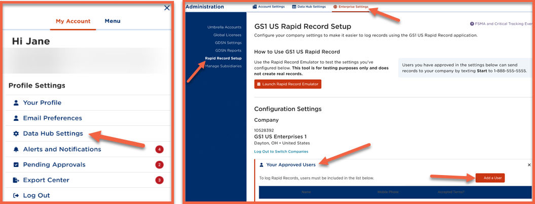 From GS1 US Data Hub, navigate to My Account, then click on Data Hub Settings, then go to the Enterprise Settings tab